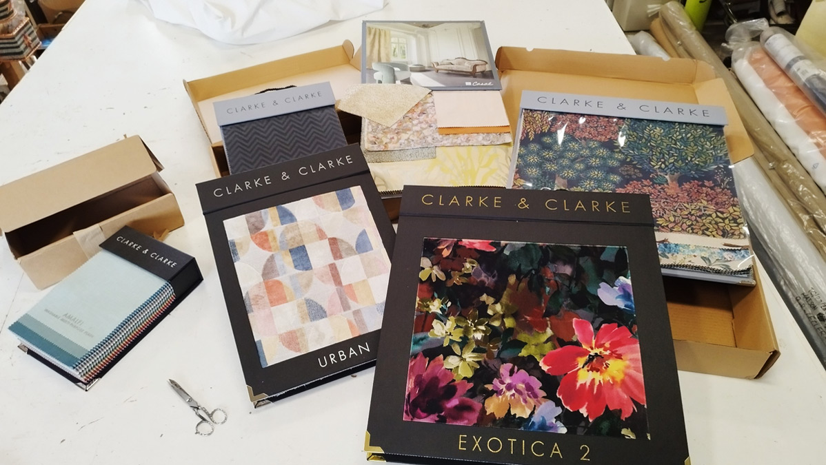 Nous disposons aussi d'une « surjeuteuse/fronçeuse » pour la confection de coussins et de rideaux. Les armoires de stockage des produits consommables et le coin de stockage des textiles et des outils de tapissier.