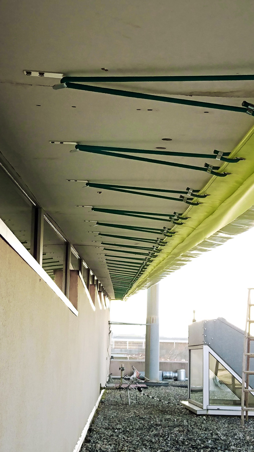 La technologie Précontraint® Serge Ferrari consiste en l'enduction sous tension (1 tonne par mètre) exercée en chaîne et trame pendant tout le cycle de fabrication. Ferrari Textile réalise un inventaire depuis plus de cinq ans sur des bâtiments fixes ou itinérants. À l'heure actuelle, cette technologie est la seule à révéler notamment une longévité largement supérieure à 20 ans, un comportement environnemental très favorable (recyclage Flexiloop), et la pérennité du classement au feu.