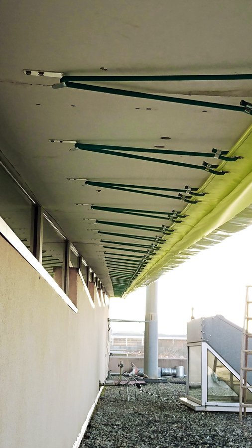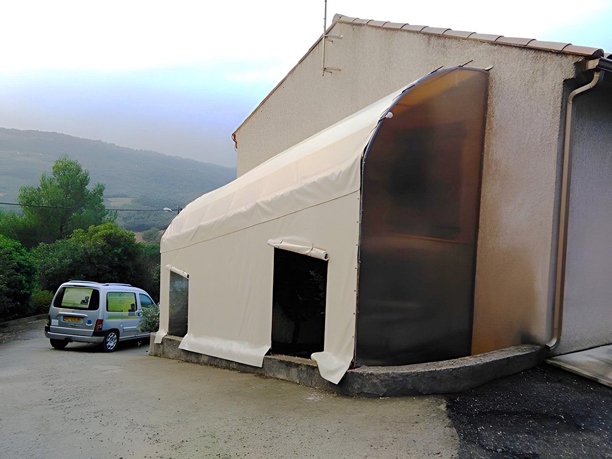 Confection toit de bungalow en toile précontraint Ferrari poutres renforcées plaques U inox