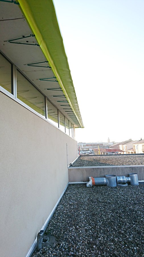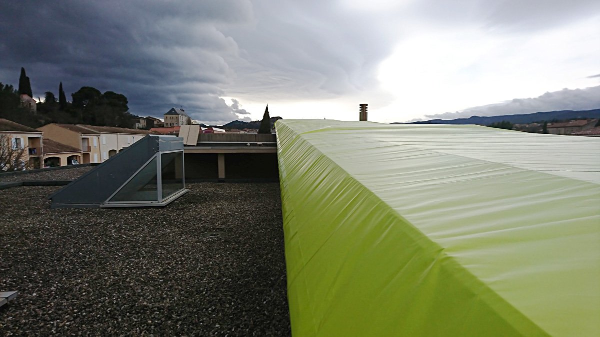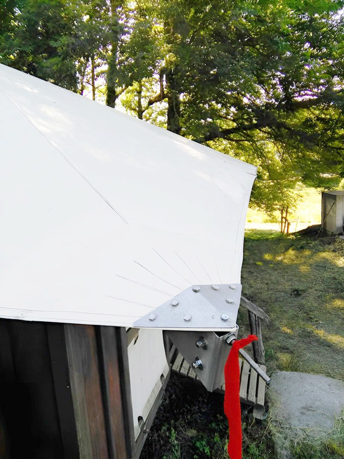 Confection toit de bungalow en toile précontraint Ferrari sur poutres renforcées plaques U inox