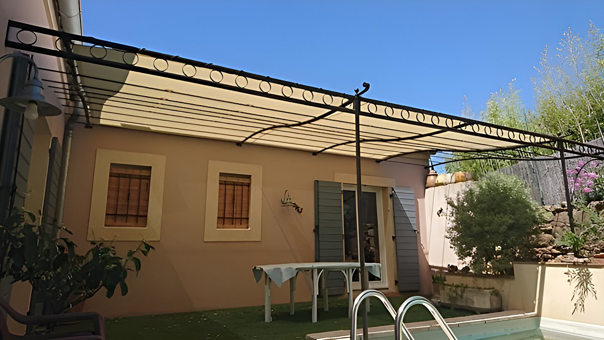 Pergola en toile Serge Ferrari Soltis Proof 502 coloris champagne