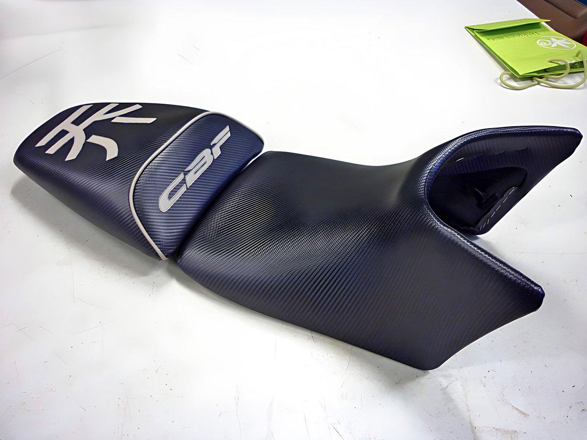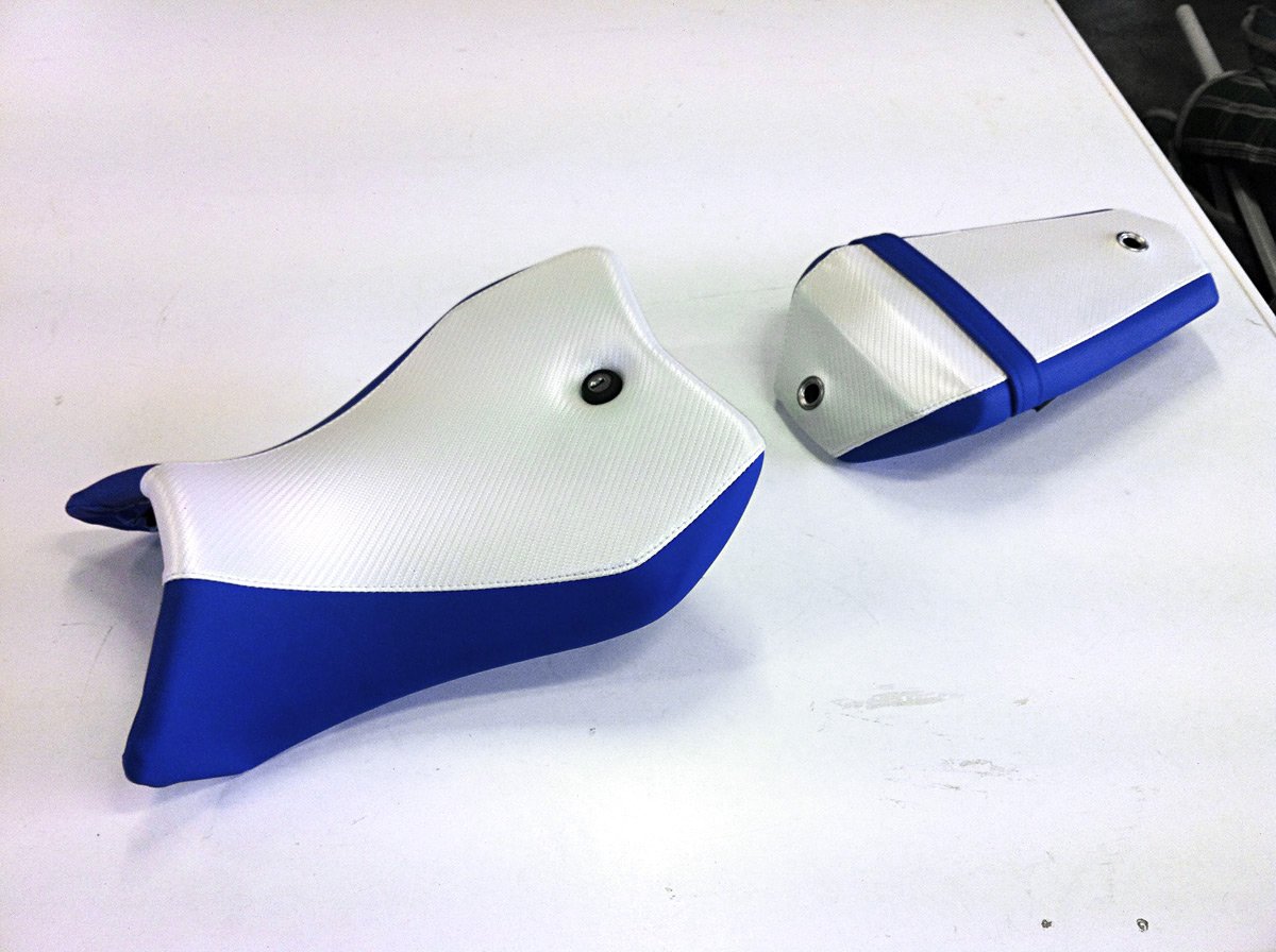 Réfection de selles de moto simili cuir bleu roi & blanc