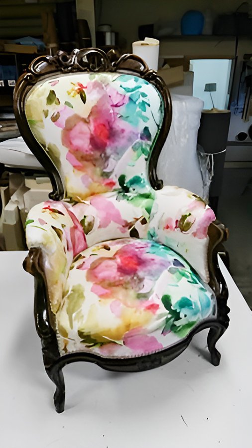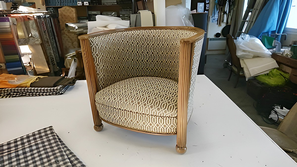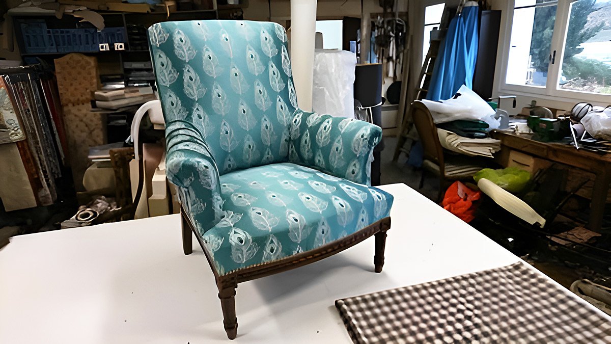 Réfection d'un fauteuil chauffeuse en tissu à motif