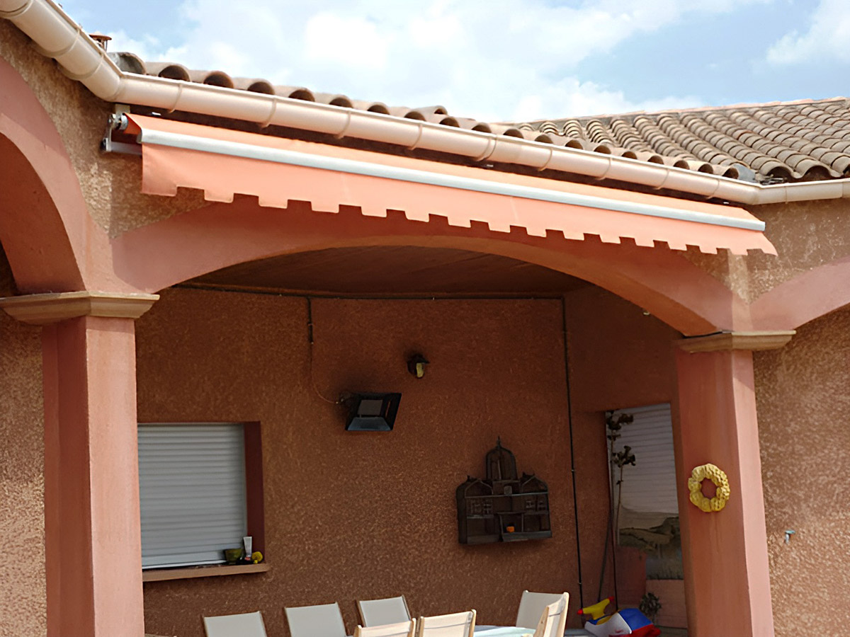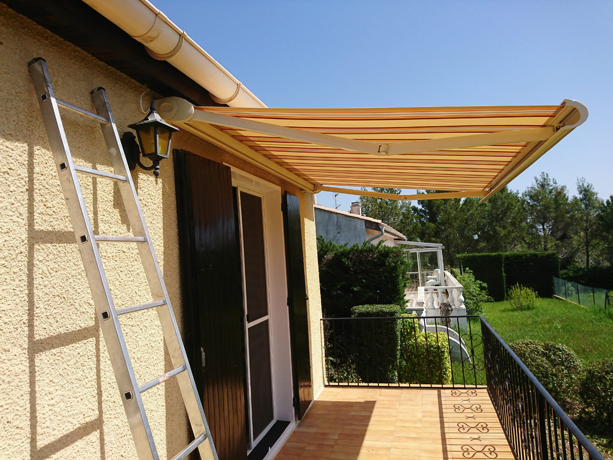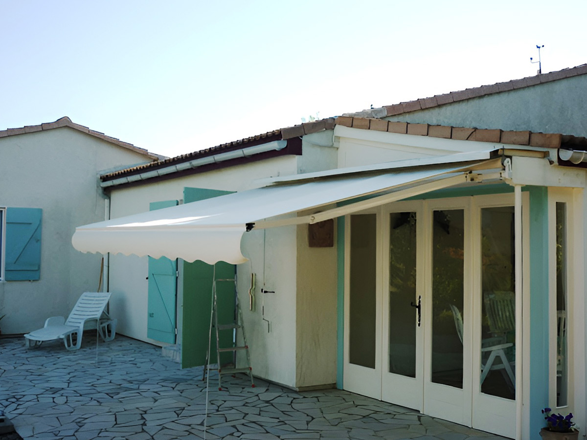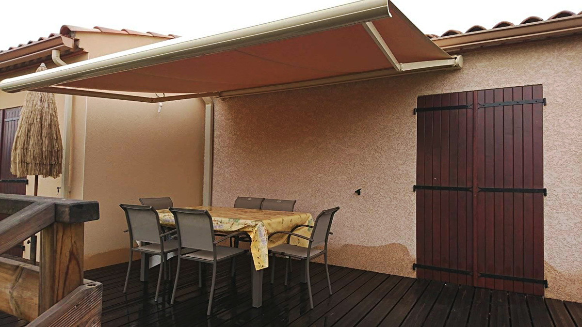 Installation d'un store à banne monobloc motorisé Somfy IO de 7,09 mètres de long couvrant 18m² d'ombre en 40 secondes et sans effort.