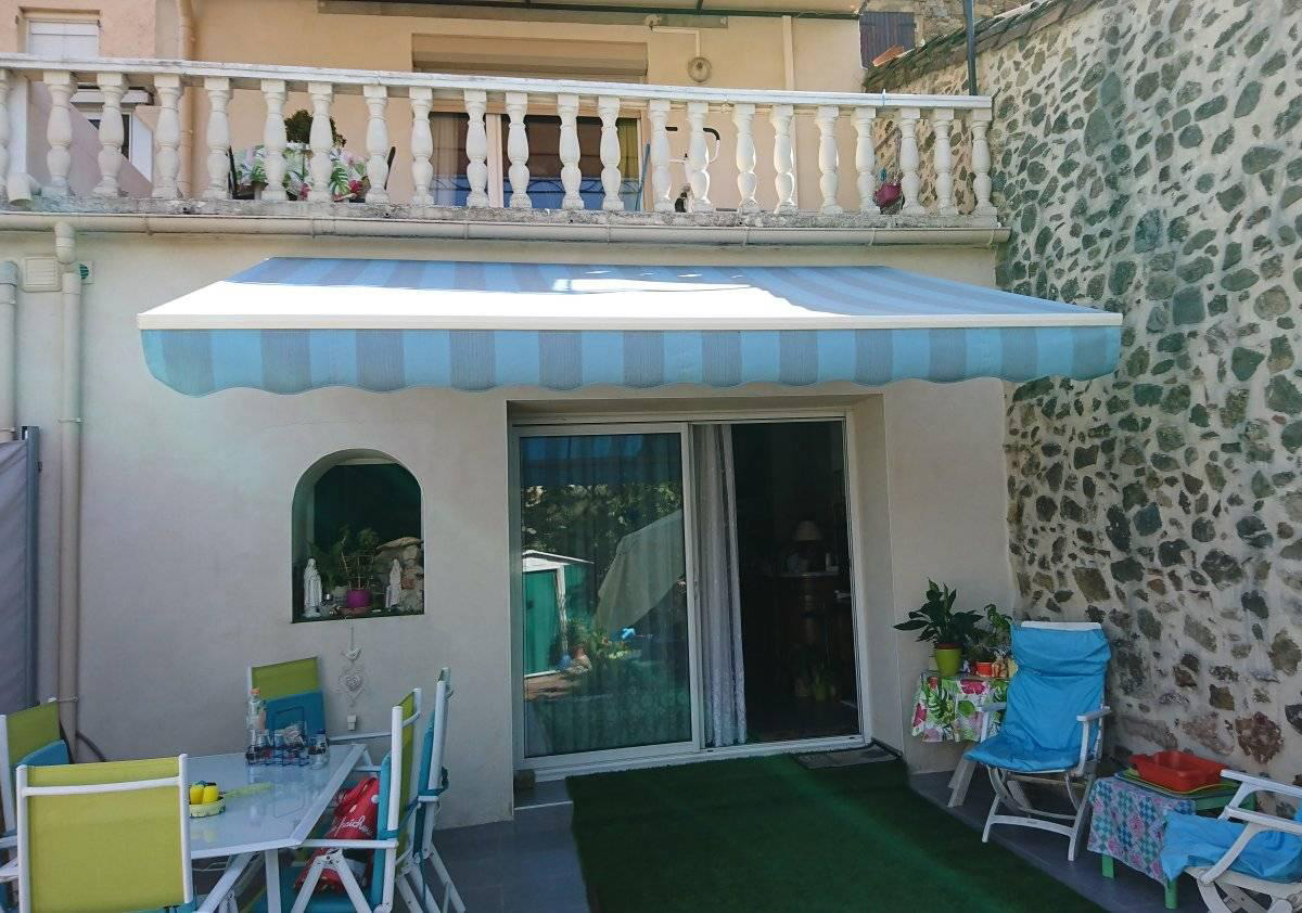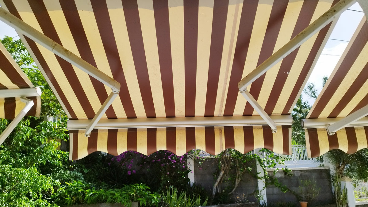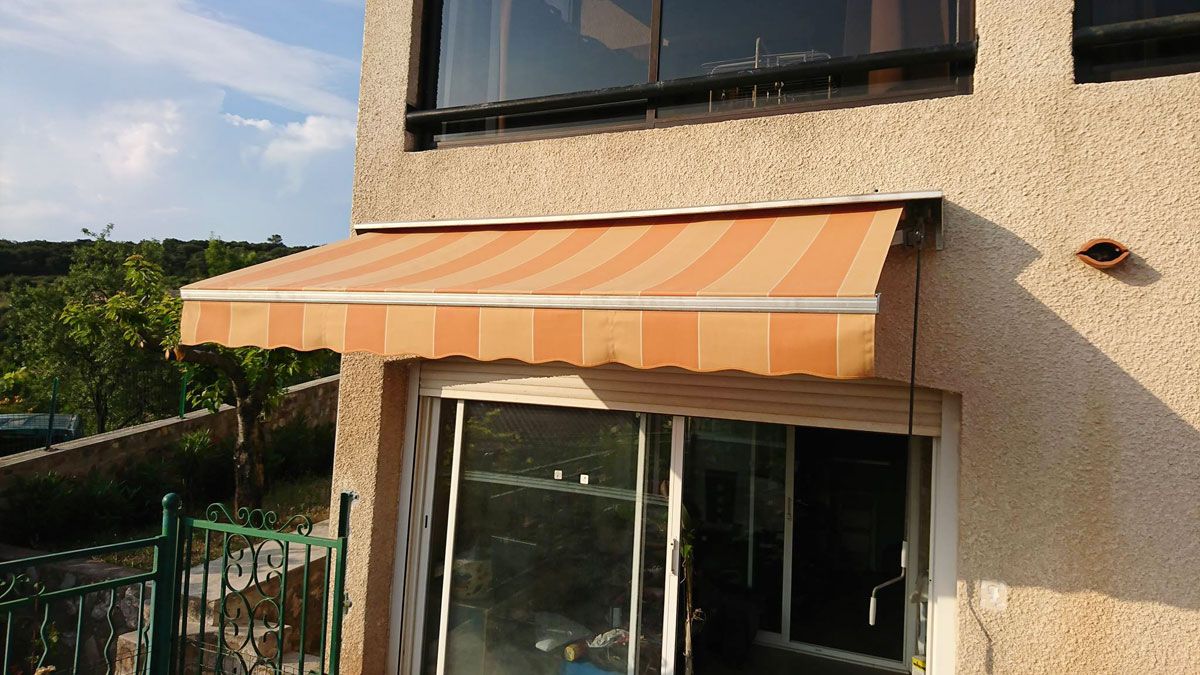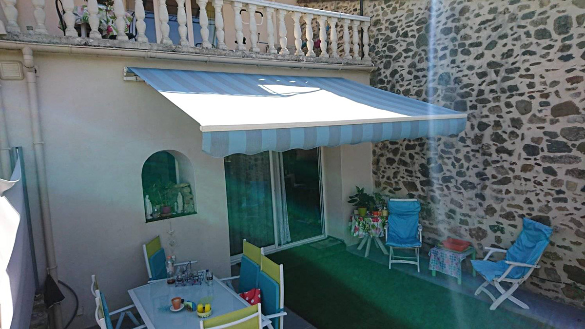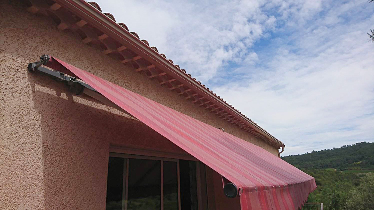 Installation d'un store à banne monobloc motorisé Somfy IO de 7,09 mètres de long couvrant 18m² d'ombre en 40 secondes et sans effort.