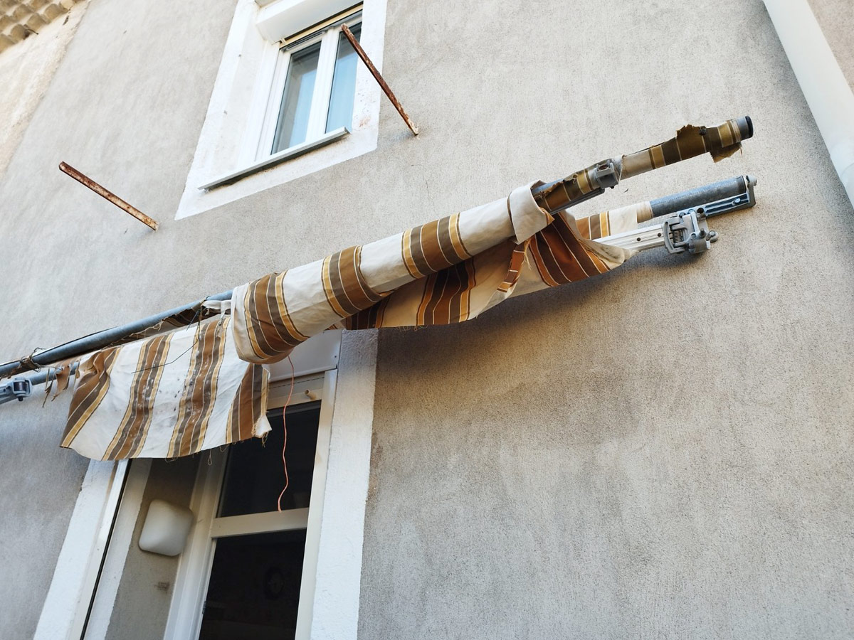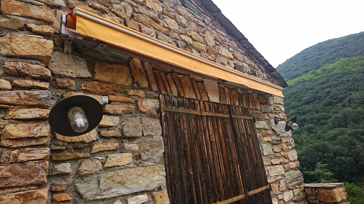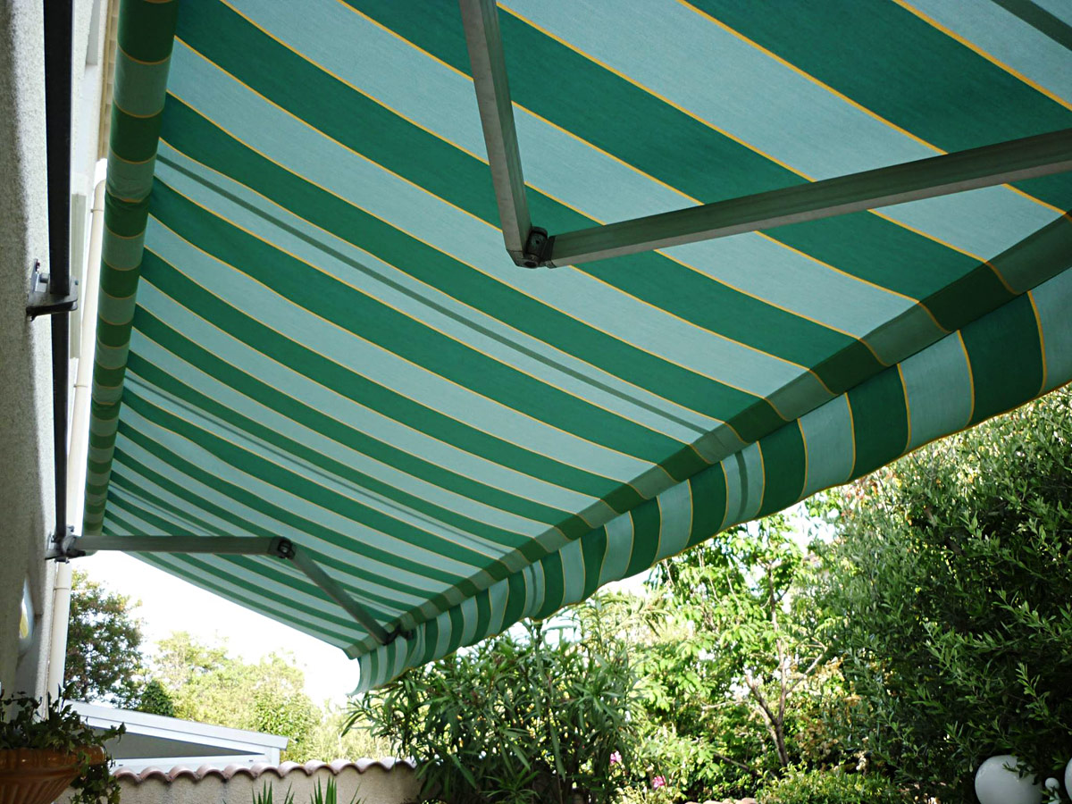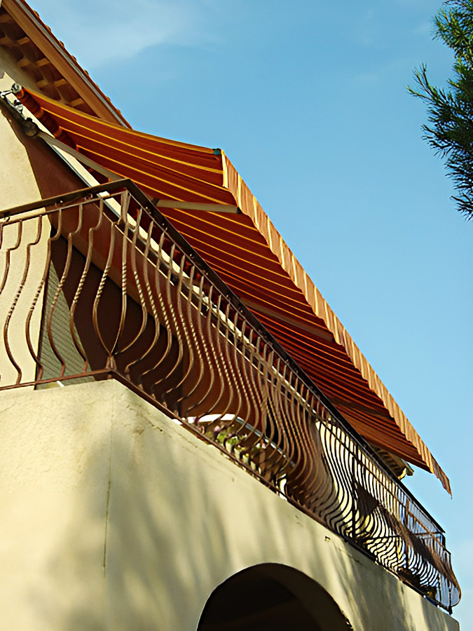 Le store à banne est soutenu par une armature de haute qualité en aluminium renforcée par des axes en inox Geomet, toile acrylique Latim. Fil de couture Tenara GORE-TEX Brand.