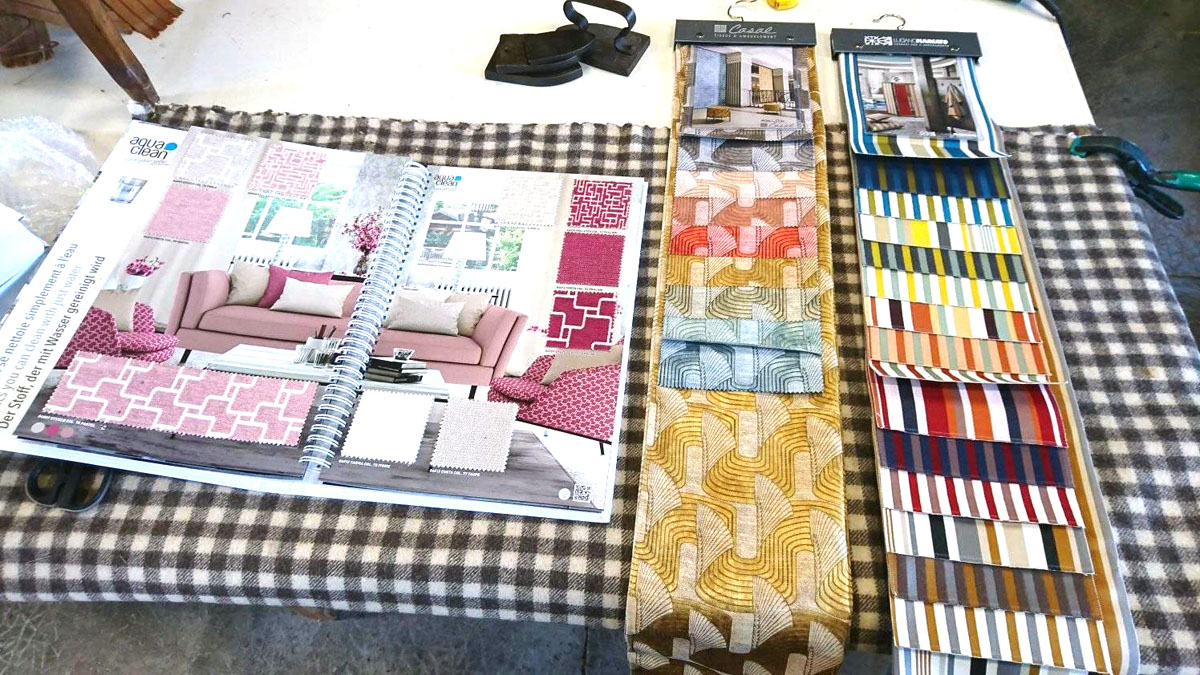 Nous disposons aussi d'une « surjeuteuse/fronçeuse » pour la confection de coussins et de rideaux. Les armoires de stockage des produits consommables et le coin de stockage des textiles et des outils de tapissier.