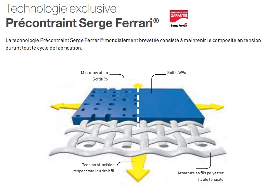 La technologie Précontraint® Serge Ferrari consiste en l'enduction sous tension (1 tonne par mètre) exercée en chaîne et trame pendant tout le cycle de fabrication. Ferrari Textile réalise un inventaire depuis plus de cinq ans sur des bâtiments fixes ou itinérants. À l'heure actuelle, cette technologie est la seule à révéler notamment une longévité largement supérieure à 20 ans, un comportement environnemental très favorable (recyclage Flexiloop), et la pérennité du classement au feu.