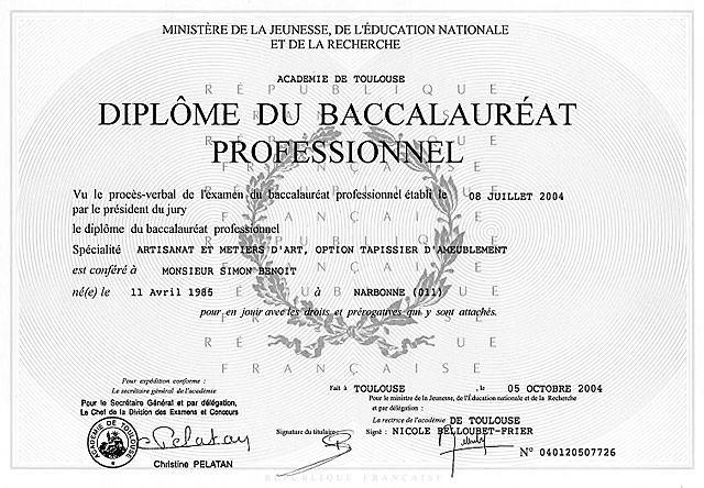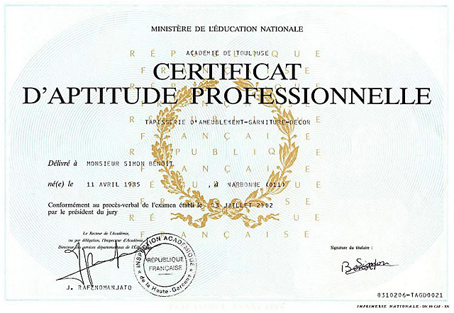 De part ma formation, mes diplômes obtenus (CAP + BAC PRO Tapissier d'ameublement), mon cursus et mon expérience professionnelle exercée depuis 2008, je suis reconnu comme artisan d'art par la Chambre de Métiers et de l’Artisanat.