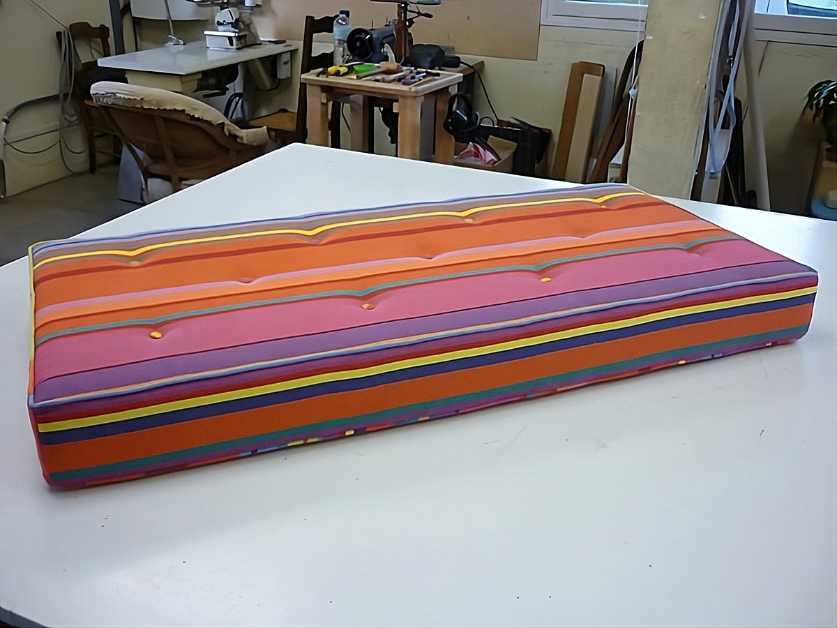 Coussins pour salon de jardin, tissu Antibes outdoor, coloris coquille acrylique résistant UV, traité teflon, finition passepoil, garniture mousse haute résilience