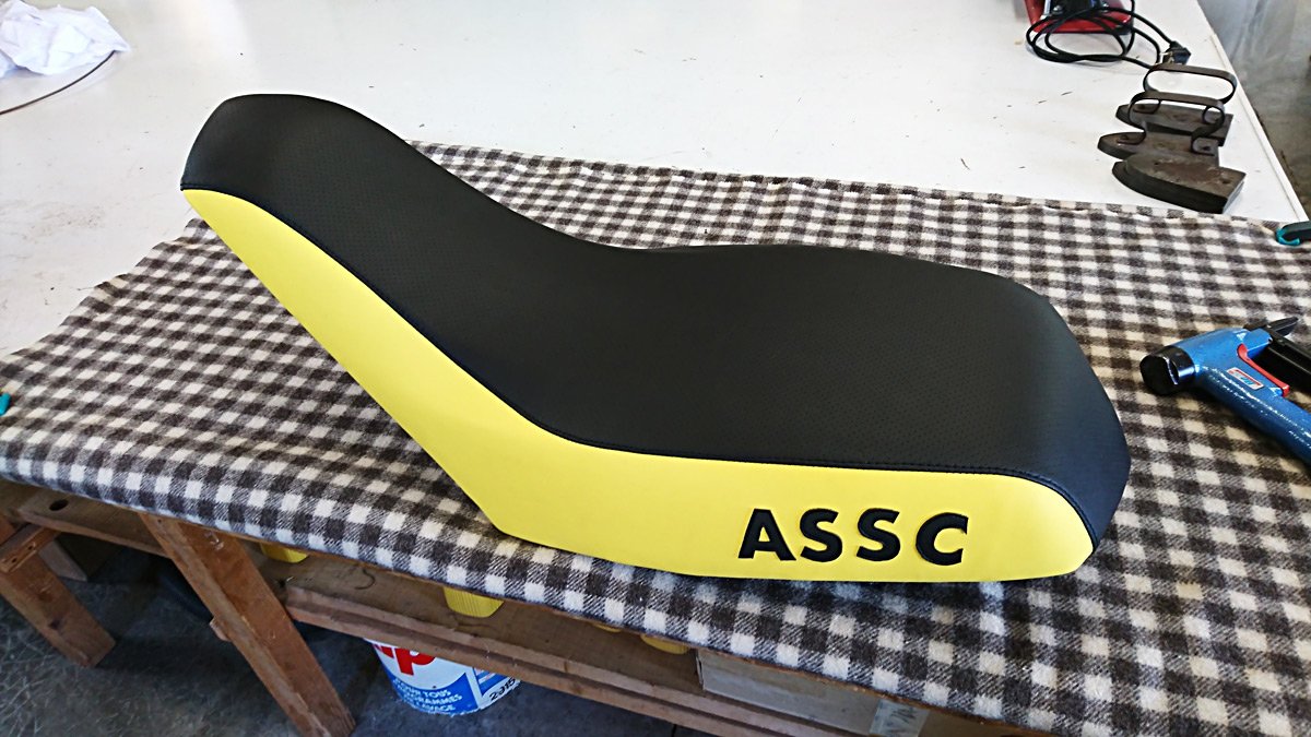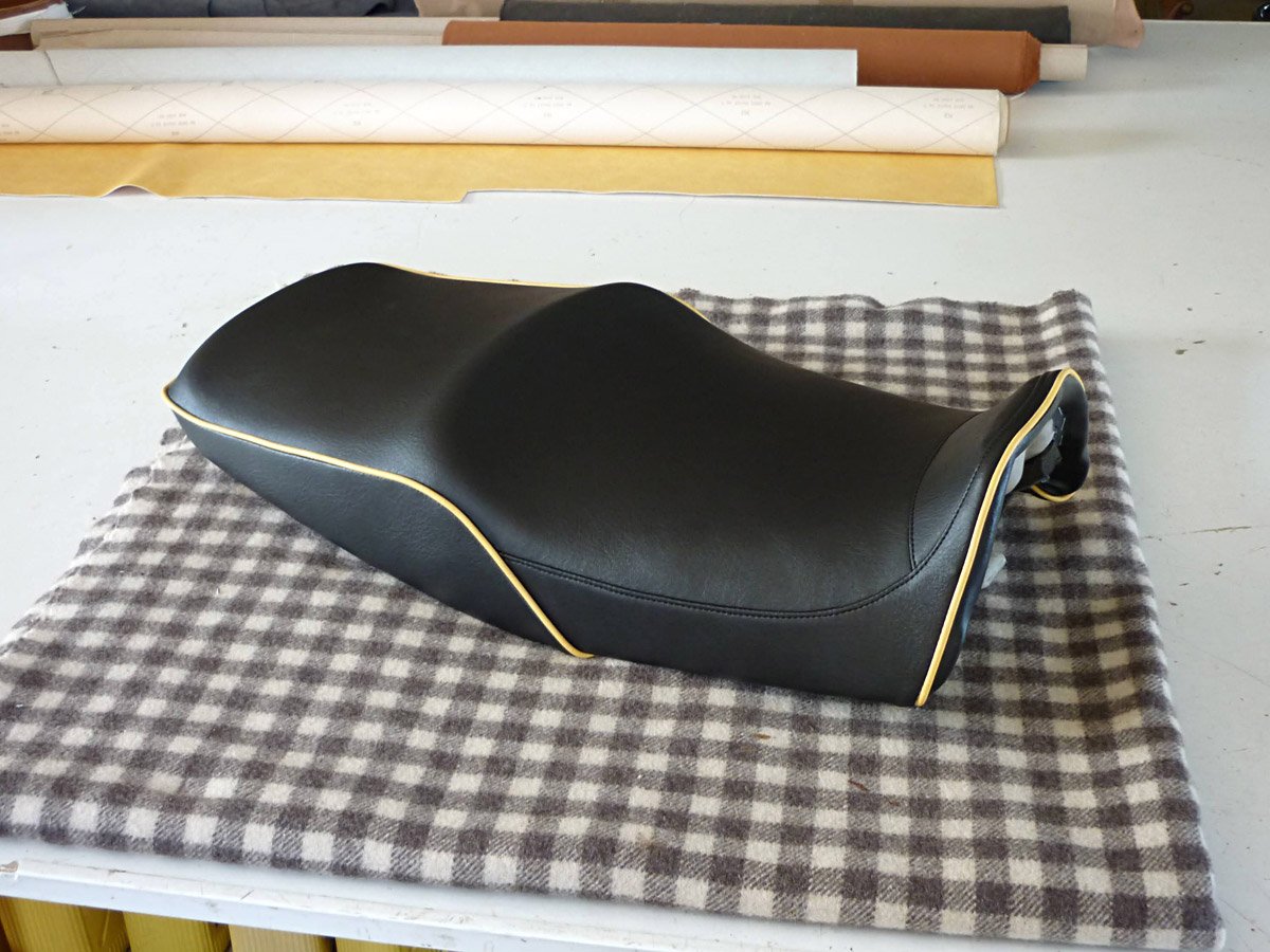 Réfection d'une selle de moto en cuir noir liseré jaune