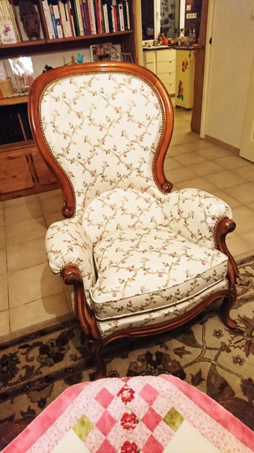 Réfection d'un fauteuil chauffeuse en tissu à motif