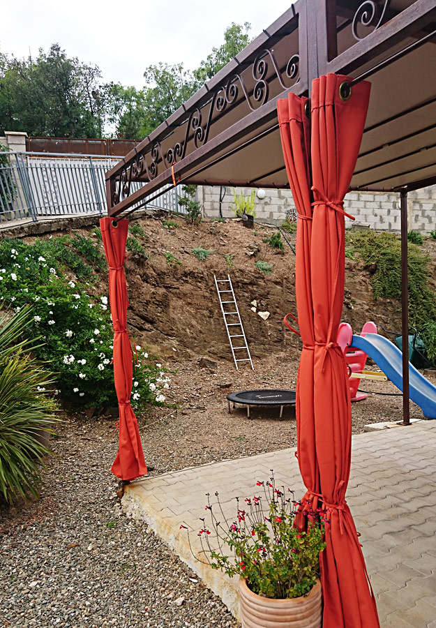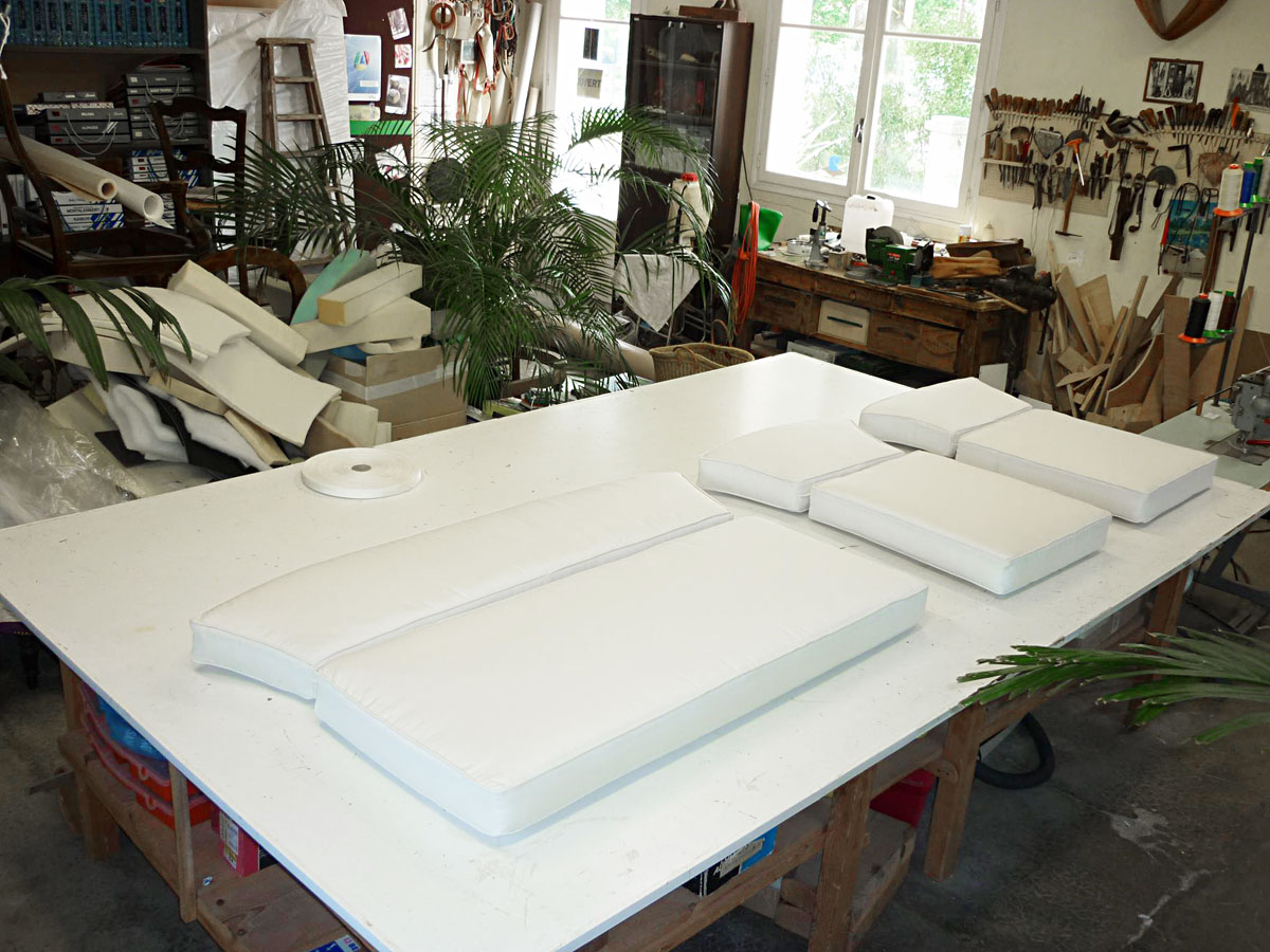 Confection d'un salon d'extérieur avec coussins déhoussables pour La Demeure d'Aphrodite à Babeau-Bouldoux dans le sud-ouest Hérault.