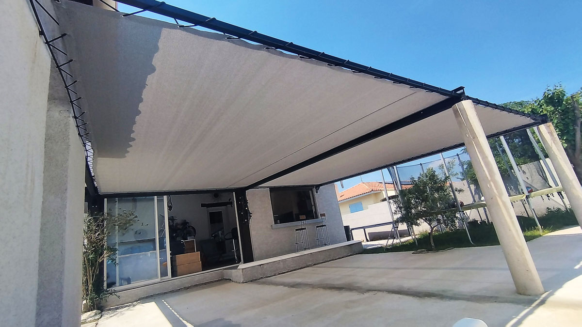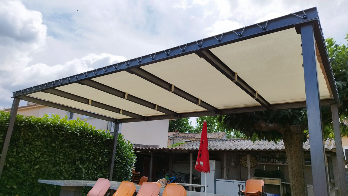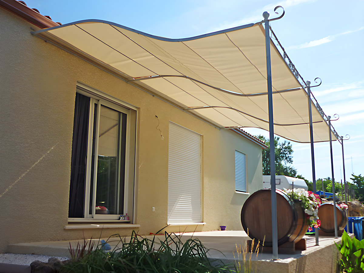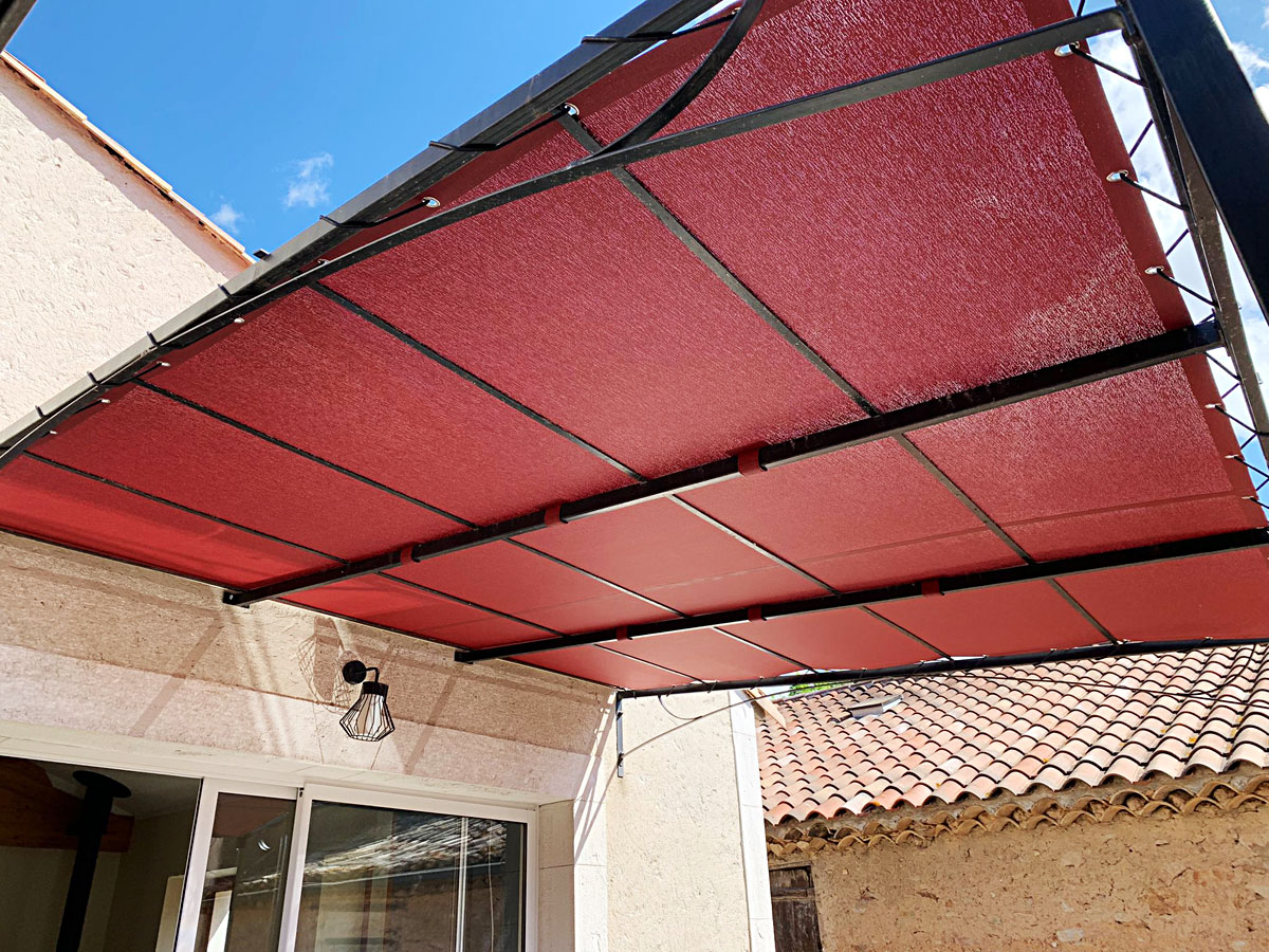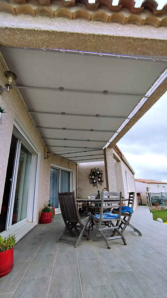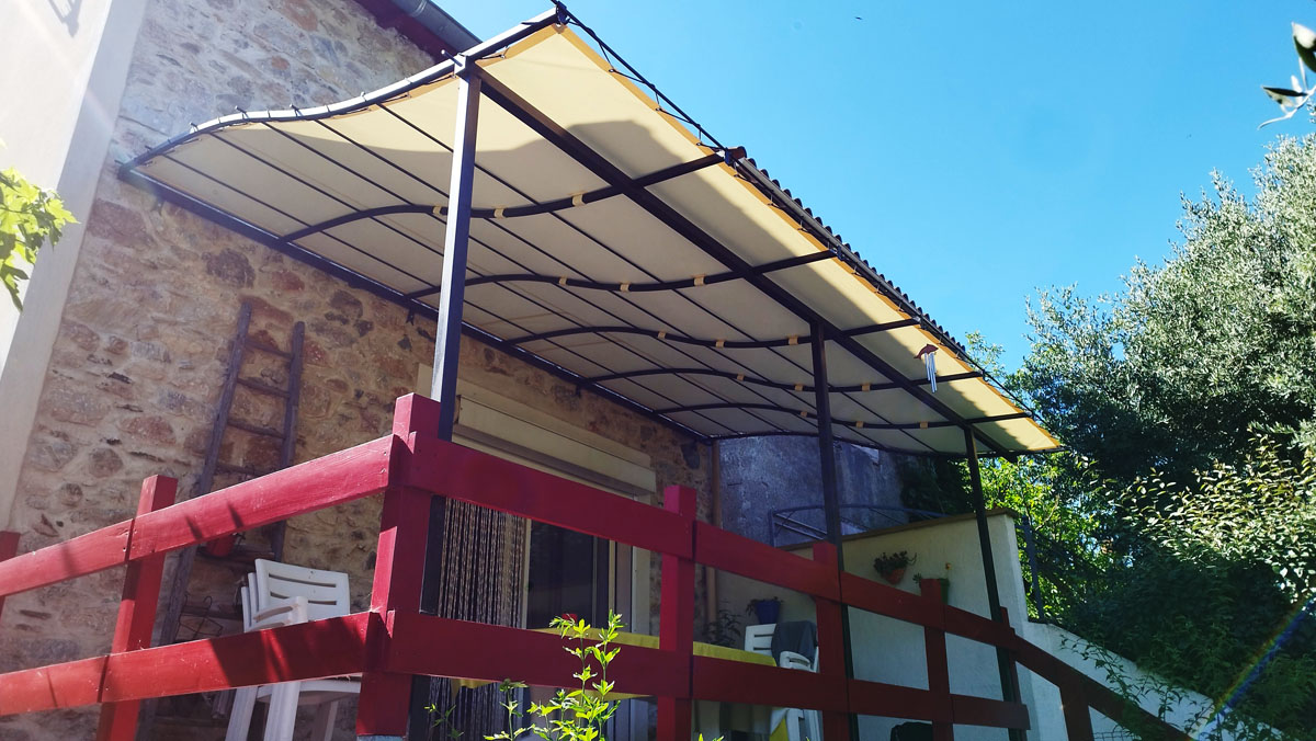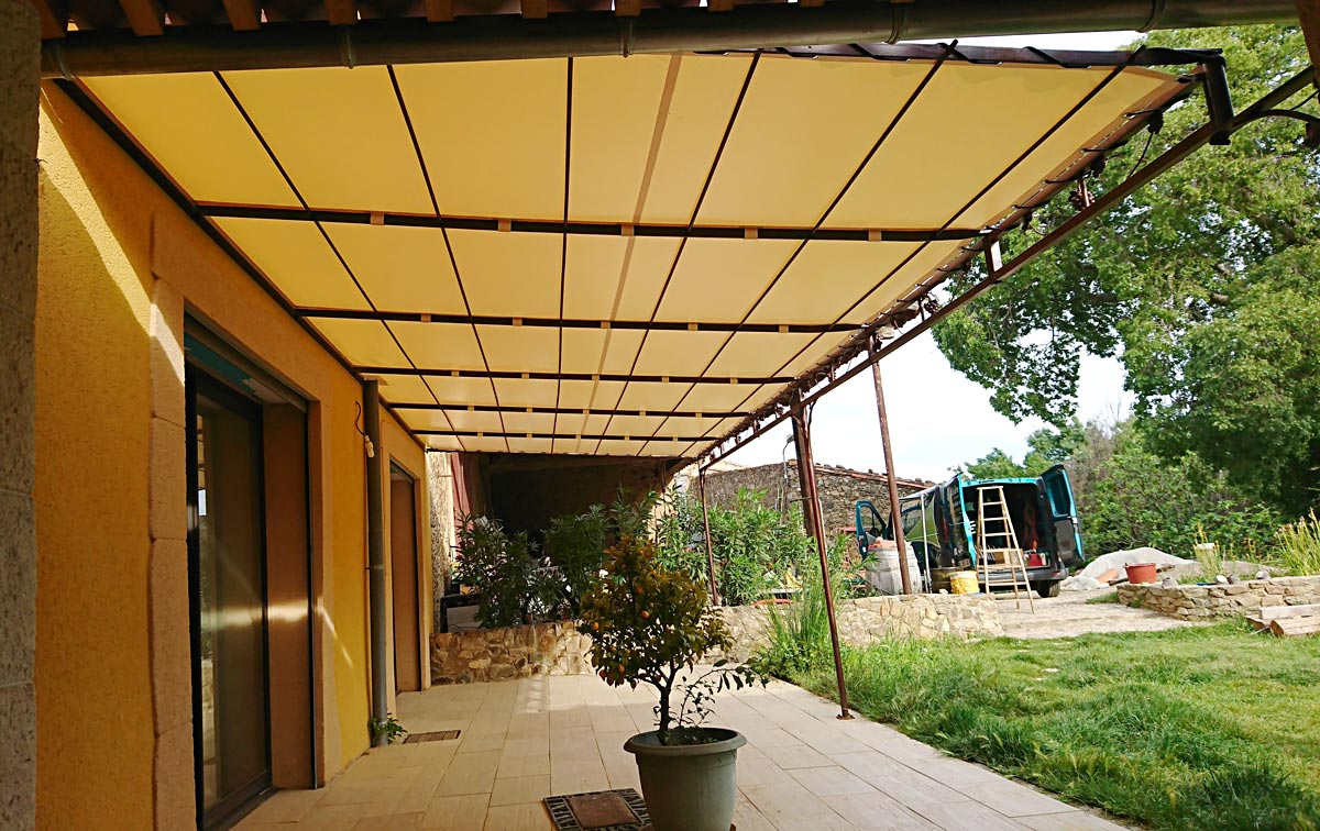 Confection et pose d'une toile de pergola avec Soltis Proof W96 Serge Ferrari à Saint-Chinian pour le projet d'aménagement d'une terrasse d'habitation d'un particulier qui a confié son projet à la Maison Simon.