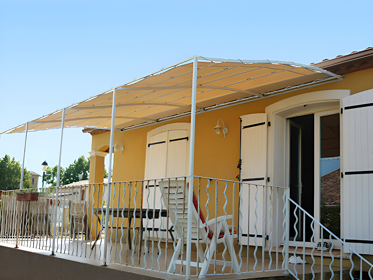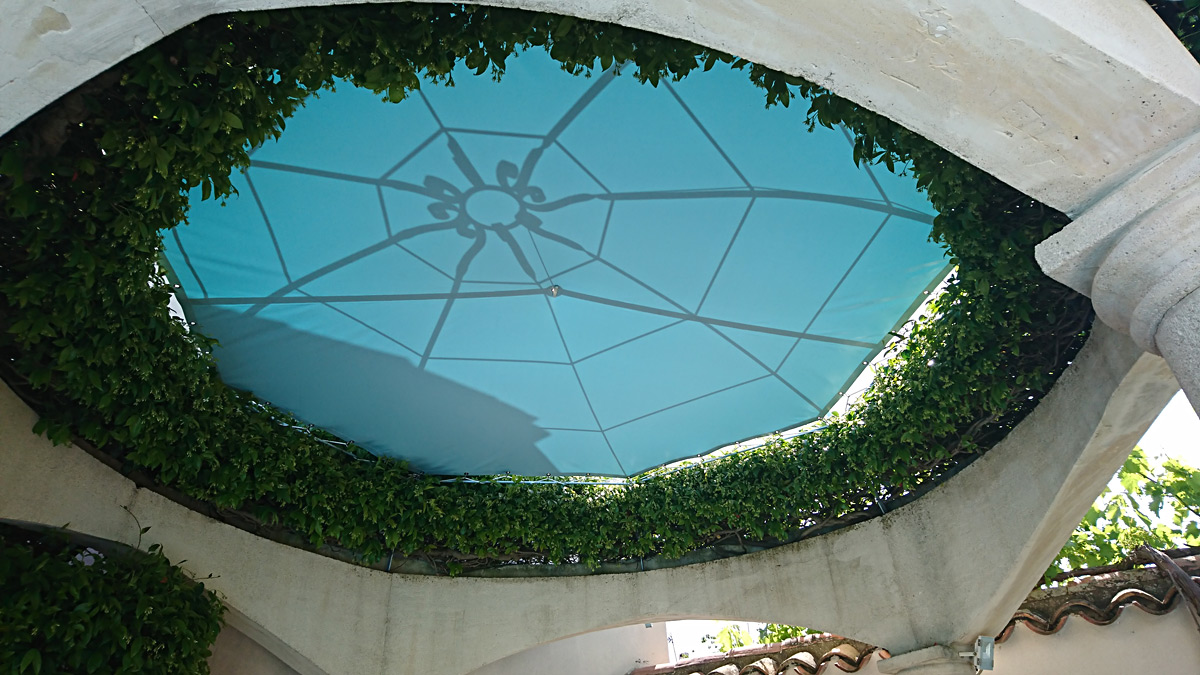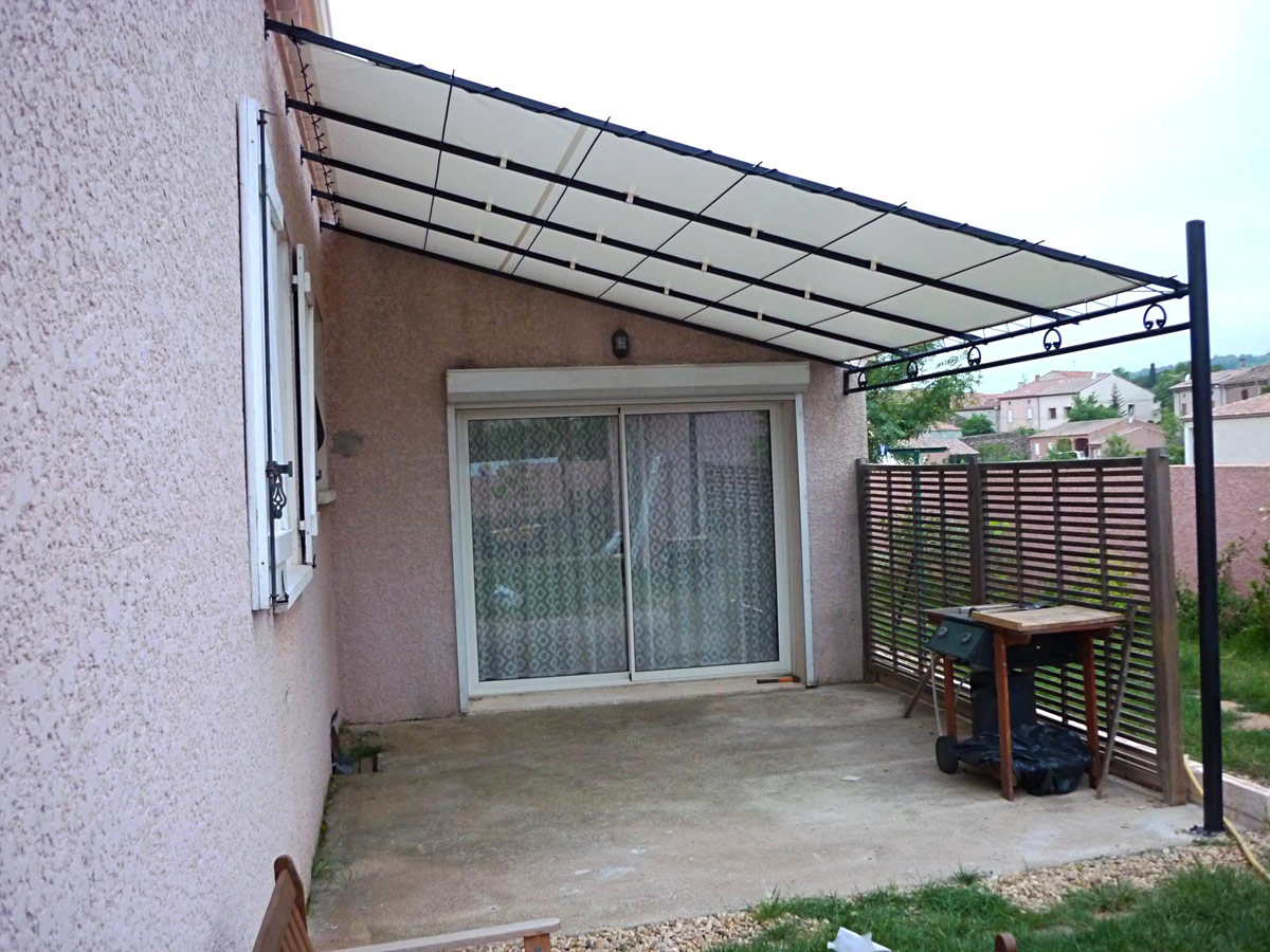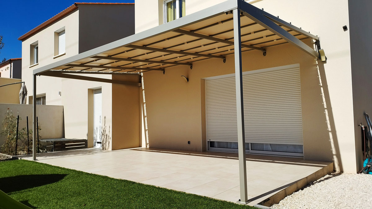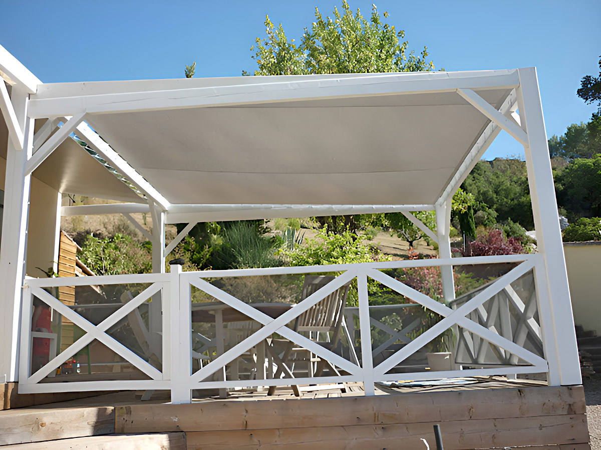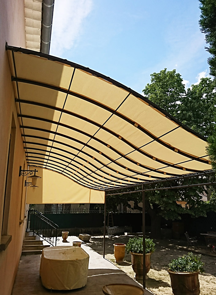 Confection et pose d'une toile de pergola avec Soltis Proof W96 Serge Ferrari à Saint-Chinian pour le projet d'aménagement d'une terrasse d'habitation d'un particulier qui a confié son projet à la Maison Simon.