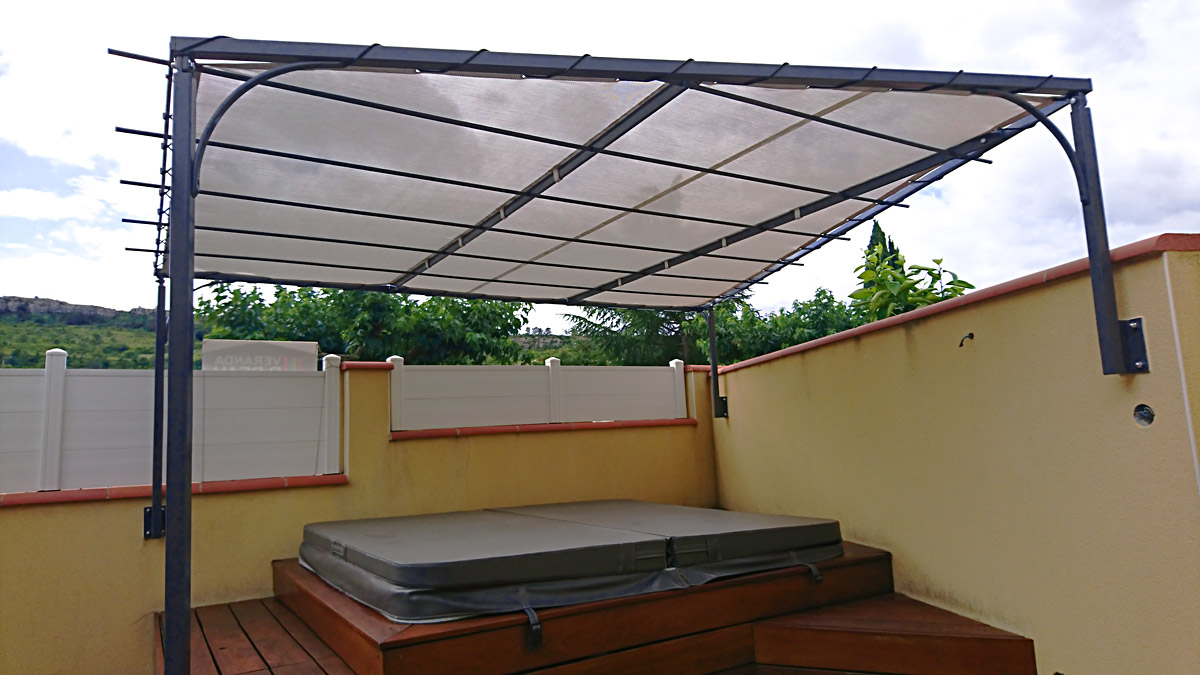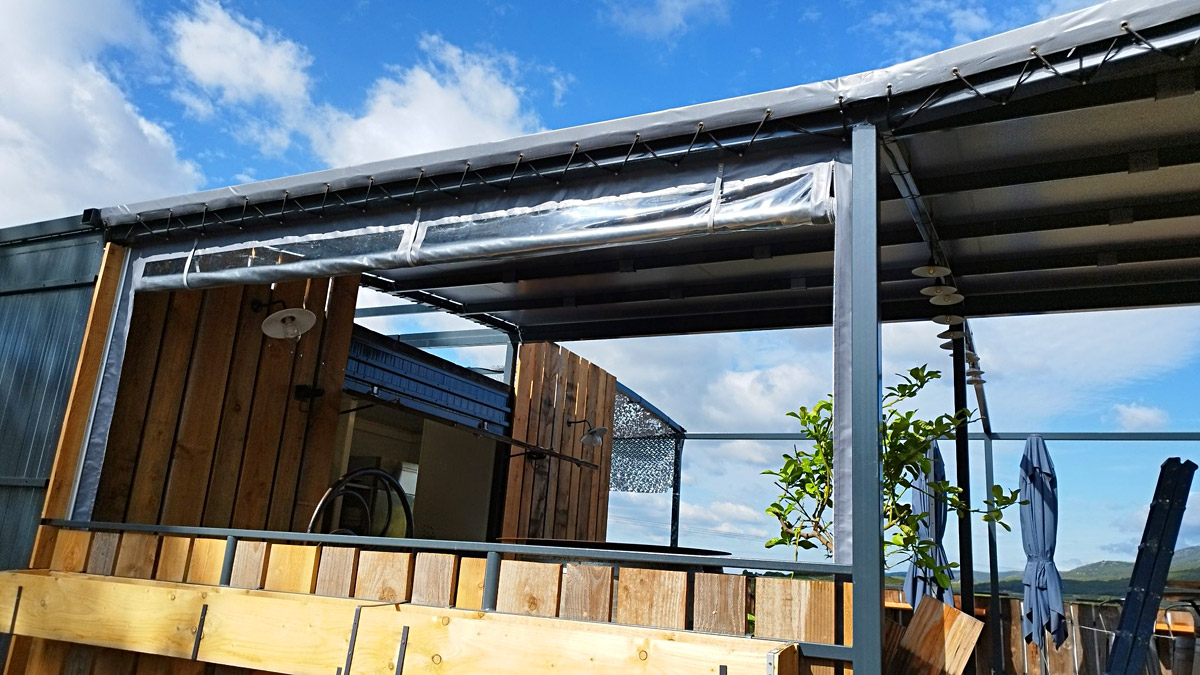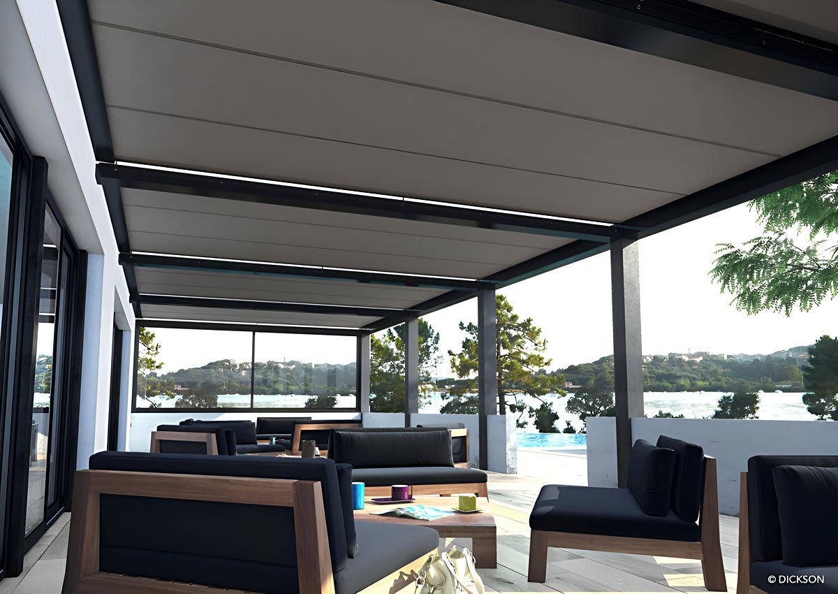 Toile de pergola confectionnée sur-mesure avec la toile transparente et imperméable Soltis Proof W96 Serge Ferrari en coloris "Blanc cassé".